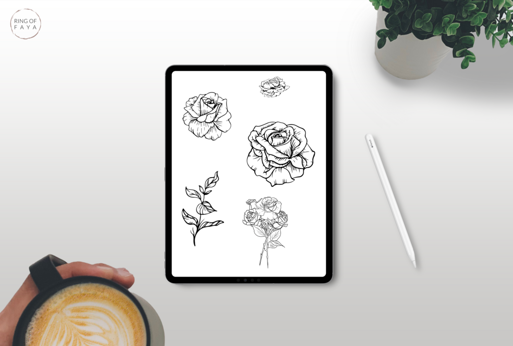 In this Tattoo stencil brush set these are 41 Rose stamps designed for Procreate application.